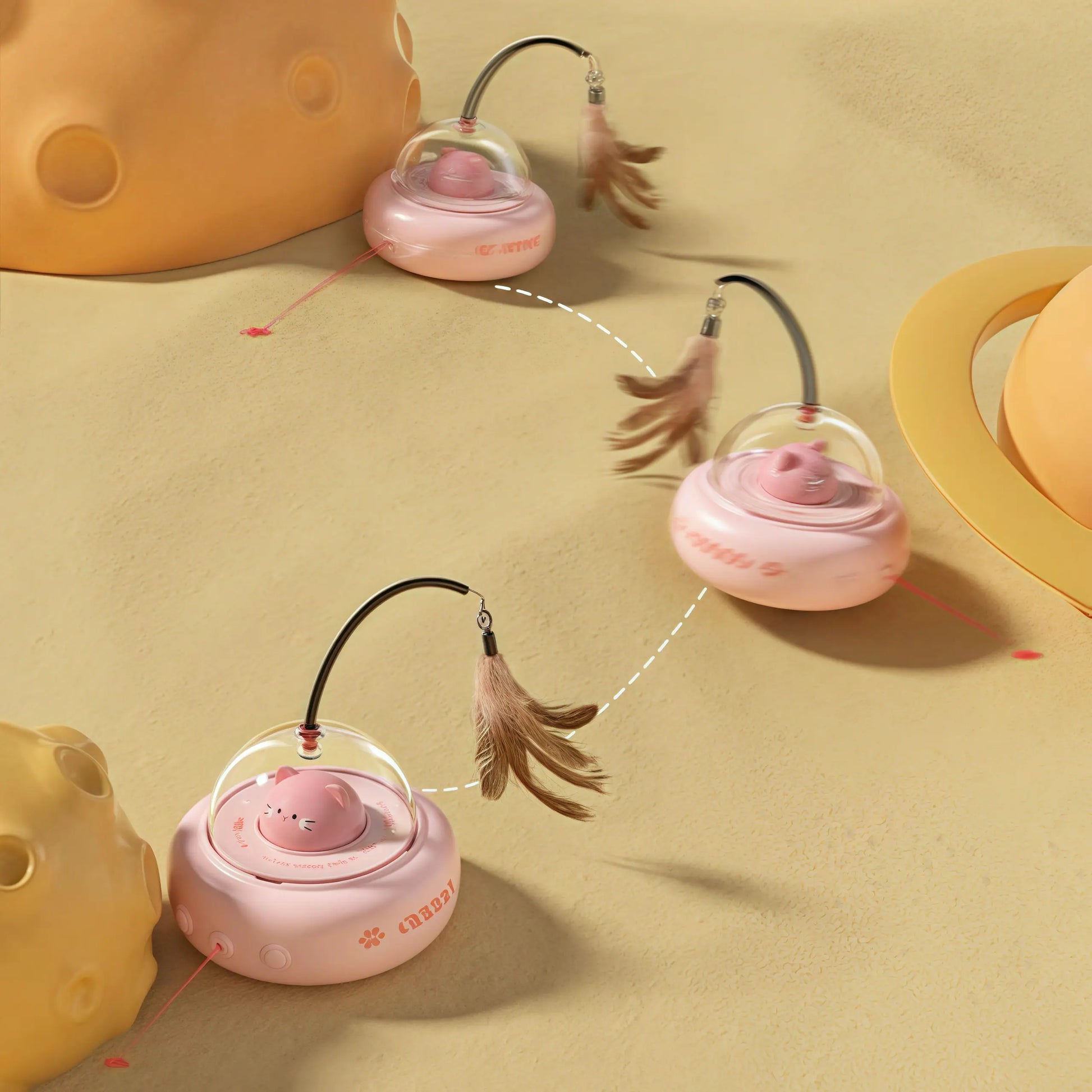 This isn't just a toy—it's a cosmic hunting adventure buddy. Designed to ignite chase instincts and solo fun, this smart UFO teaser swings natural feathers and beams safe lasers for endless interactive play, banishing boredom in a flash.