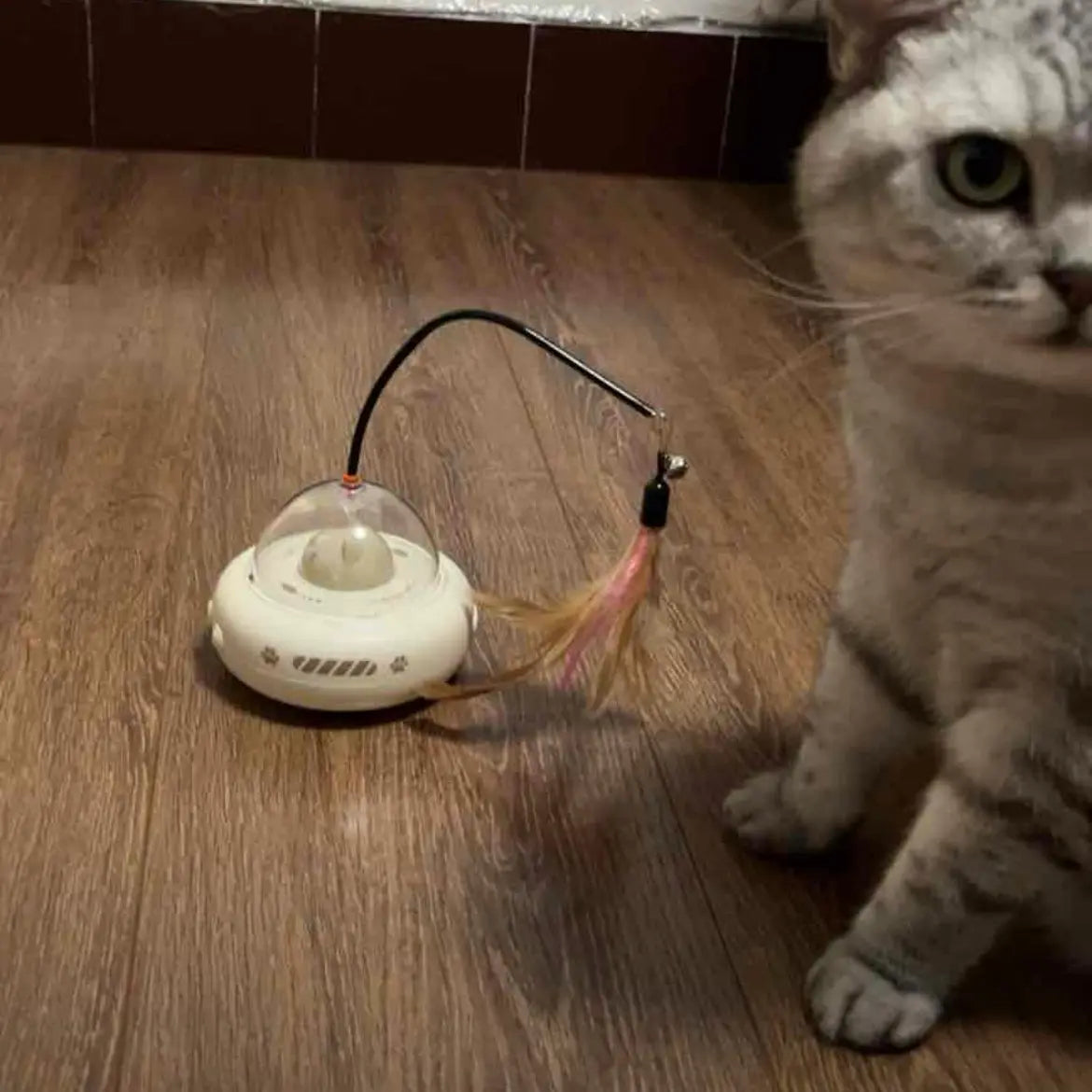 "Love how my gray tabby pounces on this UFO teaser right out of the box—those swinging feathers spark endless floor chases without any harm!"