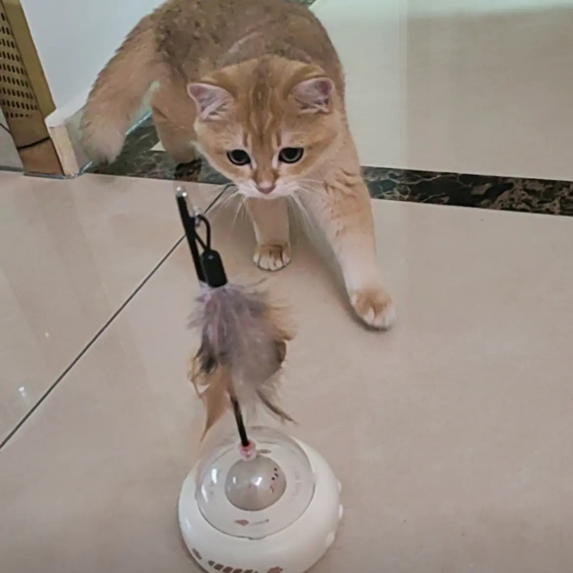 Game-changer for my energetic tabby! It beams safe lasers and flutters natural feathers, tiring her out with 360° avoidance. We bond over play without me lifting a finger—rechargeable magic!